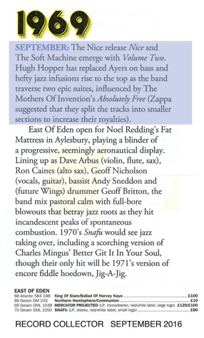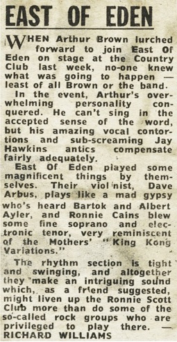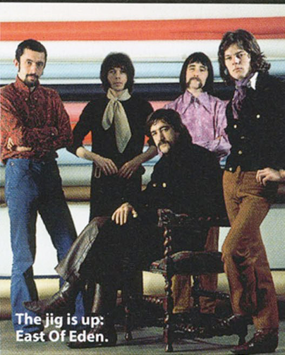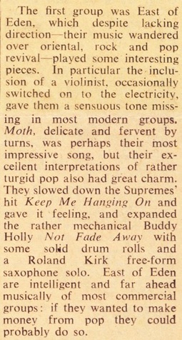 'East of Eden, the British Progressive group combine in their music the rhythm and sounds of free jazz collective improvisation and atonal music as well as the influence of Eastern and African forms. They present the improvisations of Coltrane and Archie Shepp synthesised with Rock music. Ron Caines controls his saxophone with a masterly display of stage craft and is perhaps technically the most outstanding of the band'.