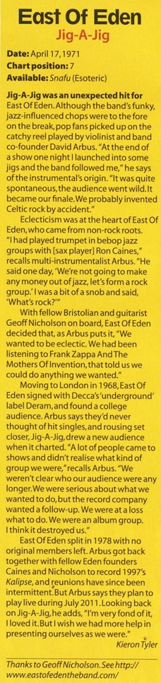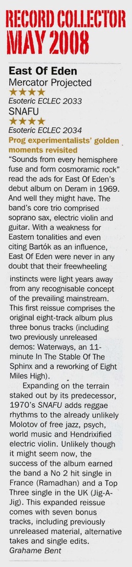'Also East of Eden- a surprising group which weaves together free form saxophone sounds, old bide tunes, a legato Wayne Kingish Charmaine phrase or two, Edgar Varese sounds, and a swinging violin bit of pure Irish Jigs and reels'.